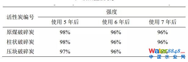 活性炭的強(qiáng)度與活性炭的使用壽命有一定的關(guān)系,活性炭應(yīng)保證足夠的機(jī)械強(qiáng)度,沖洗時(shí)耐磨損,損耗率較小。由表3可知,舊炭雖然使用了多年,但強(qiáng)度仍較高,高于國(guó)家標(biāo)準(zhǔn)規(guī)定的90%,使用年限對(duì)活性炭強(qiáng)度的影響不大。