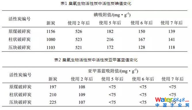 定期檢測(cè)炭池內(nèi)活性炭的碘吸附值、亞甲基藍(lán)吸附值、粒度、強(qiáng)度等指標(biāo)。當(dāng)其數(shù)值低于某一限定值時(shí),就需換炭。就楊樹浦水廠活性炭而言,在使用多年后強(qiáng)度依然較高,各格炭池中的活性炭強(qiáng)度都≥95%,且粒度集中在12×40目,炭池運(yùn)行過程中未出現(xiàn)堵塞現(xiàn)象。因此,從活性炭粒度、強(qiáng)度指標(biāo)角度分析來看,各格炭池仍可繼續(xù)使用。