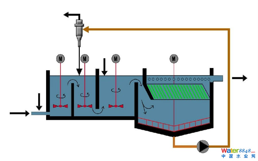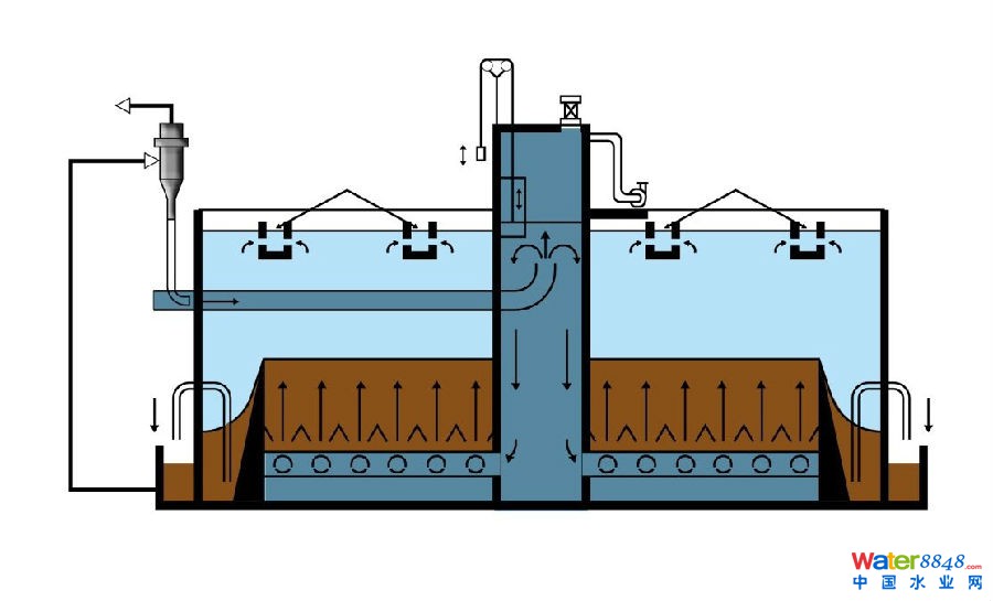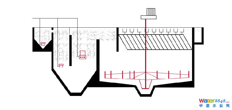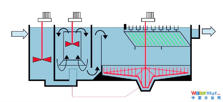 將沉淀的部分污泥回流到反應(yīng)區(qū),增大污泥濃度。另一方面,在反應(yīng)區(qū)以導(dǎo)流的方式形成內(nèi)循環(huán),根本目的是形成大、密實(shí)、均一的礬花,從而實(shí)現(xiàn)泥水的快速分離,上升流速:15-25m/h。適合于:占地緊張的情況;原水污染濃度較高情況;一級(jí)化學(xué)加藥強(qiáng)化處理;與曝氣生物濾池組合應(yīng)用