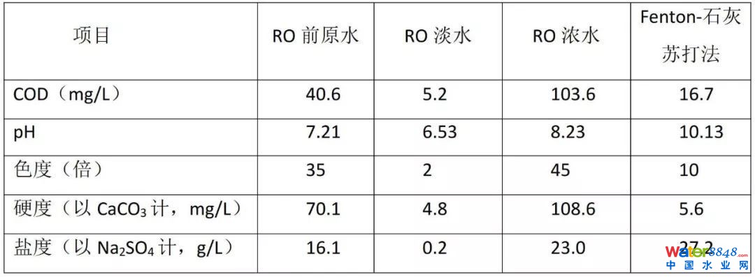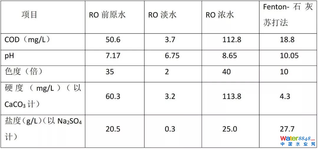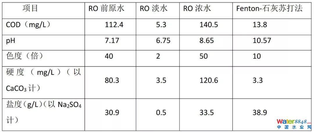 表1 反滲透(RO)處理前后及濃水經(jīng)Fenton氧化耦合石灰蘇打法沉淀處理前后的水質(zhì)