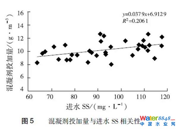 常州QT污水處理廠是典型的進(jìn)水以生活污水為主的污水處理廠,進(jìn)水SS和BOD5均呈現(xiàn)出顯著的季節(jié)規(guī)律性(圖4),冬春季進(jìn)水SS和BOD5濃度較高,而夏秋季進(jìn)水SS和BOD5較低,這可能是污泥產(chǎn)率呈季節(jié)性波動(dòng)的主要原因。此外,研究還發(fā)現(xiàn),該廠污水處理單元混凝劑投加量與進(jìn)水SS呈正相關(guān)性(圖5),進(jìn)水SS較高時(shí)一般會(huì)投加更多混凝劑,產(chǎn)生更多的化學(xué)污泥,這進(jìn)一步增大了污泥產(chǎn)率隨SS濃度的波動(dòng)幅度。