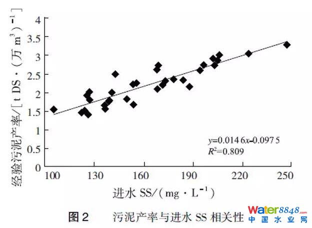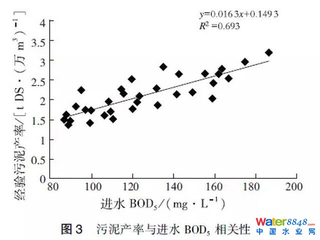 (2)經(jīng)驗(yàn)污泥產(chǎn)率與進(jìn)水有機(jī)物含量和懸浮固體濃度呈顯著正相關(guān)性,冬春季進(jìn)水SS和BOD5濃度較高,而夏秋季進(jìn)水SS和BOD5濃度較低,這可能是污泥產(chǎn)率呈現(xiàn)季節(jié)性波動(dòng)的主要原因。