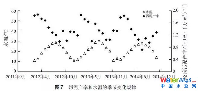 2012年1月~2014年12月QT污水處理廠污泥產(chǎn)率隨水溫季節(jié)波動(dòng)規(guī)律如圖7所示,夏季溫度較高,污泥產(chǎn)率較低;冬季溫度較低,污泥產(chǎn)率則相對(duì)較高。我國大部分區(qū)域四季分明,溫度季節(jié)變化顯著,污泥產(chǎn)率伴隨溫度相應(yīng)發(fā)生變化,這可能是污泥產(chǎn)率呈現(xiàn)出季節(jié)規(guī)律性的原因之一。