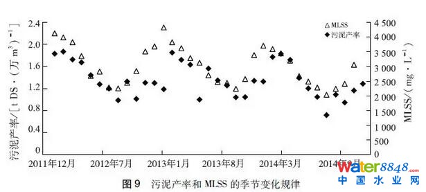 (4)為保證低溫硝化效果,污水處理廠通常會(huì)在冬季提高生化反應(yīng)池MLSS濃度,微生物量越多產(chǎn)生的污泥量相應(yīng)越多,這可能是冬季污泥產(chǎn)率較高的另一原因。