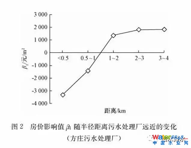 基于上述方法分析北京其他污水處理廠對各自周邊房價的影響(見表3)。可以看到,兩類污水處理廠對周邊房價的影響具有顯著差異。第一類污水處理廠(方莊、肖家河、高碑店)給周邊環(huán)境帶來直接的負面影響,房價受到明顯的抑制作用。其中以方莊為典型,房產(chǎn)距離污水處理廠越近,所受負面影響越大。