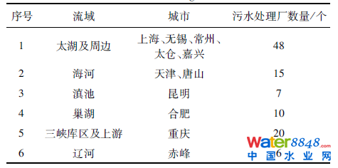 本研究調(diào)研時間跨度為2012年1月~2014年12月,調(diào)研范圍覆蓋太湖、巢湖、海河、遼河、滇池和三峽庫區(qū)及上游等6大流域,包括上海、常州、嘉興、太倉、無錫、合肥、天津、唐山、赤峰、昆明、重慶等11座城市的106座城鎮(zhèn)污水處理廠(表1),總設(shè)計污水處理能力為1 519萬m³/d,實(shí)際污水處理能力為1 264萬m³/d,污泥年產(chǎn)生量為313萬t(含水率80%),污水處理能力和污泥產(chǎn)量均達(dá)到全國總量的10%。污水水量、污水水質(zhì)、污泥產(chǎn)量和污泥含水率等數(shù)據(jù)均來自所調(diào)研污水處理廠的運(yùn)行日報表。