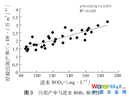 (2)經(jīng)驗(yàn)污泥產(chǎn)率與進(jìn)水有機(jī)物含量和懸浮固體濃度呈顯著正相關(guān)性,冬春季進(jìn)水SS和BOD5濃度較高,而夏秋季進(jìn)水SS和BOD5濃度較低,這可能是污泥產(chǎn)率呈現(xiàn)季節(jié)性波動的主要原因。