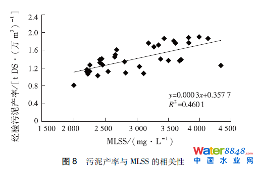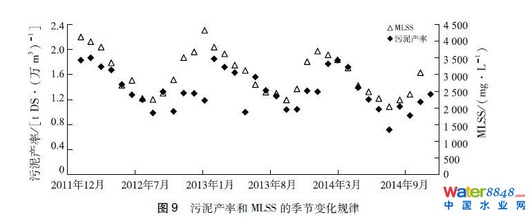 (4)為保證低溫硝化效果,污水處理廠通常會在冬季提高生化反應(yīng)池MLSS濃度,微生物量越多產(chǎn)生的污泥量相應(yīng)越多,這可能是冬季污泥產(chǎn)率較高的另一原因。