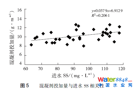 常州QT污水處理廠是典型的進(jìn)水以生活污水為主的污水處理廠,進(jìn)水SS和BOD5均呈現(xiàn)出顯著的季節(jié)規(guī)律性(圖4),冬春季進(jìn)水SS和BOD5濃度較高,而夏秋季進(jìn)水SS和BOD5較低,這可能是污泥產(chǎn)率呈季節(jié)性波動的主要原因。此外,研究還發(fā)現(xiàn),該廠污水處理單元混凝劑投加量與進(jìn)水SS呈正相關(guān)性(圖5),進(jìn)水SS較高時一般會投加更多混凝劑,產(chǎn)生更多的化學(xué)污泥,這進(jìn)一步增大了污泥產(chǎn)率隨SS濃度的波動幅度。