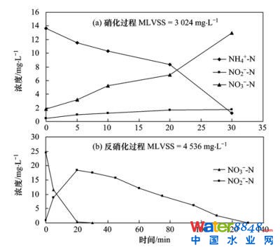 由圖5(a)可以看出,整個(gè)硝化反應(yīng)過(guò)程持續(xù)30 min,隨著NH+4-N下降,NO-3-N逐漸上升,當(dāng)NH+4-N含量降低到1.22 mg ˙L-1時(shí),NO-3-N達(dá)到12.96 mg ˙L-1,而NO-2-N在整個(gè)硝化過(guò)程中,其濃度維持在1.8 mg ˙L-1以下,NO-2-N沒有發(fā)生積累; 脫氮除磷顆粒污泥最大硝化速率[m(NH+4-N)/m(VSS) ˙t]為14.13 mg ˙(g ˙h)-1,而姜體勝等[24]在同樣條件下,獲得的脫氮除磷絮狀污泥最大硝化速率約為6.25 mg ˙(g ˙h)-1,本試驗(yàn)培養(yǎng)的顆粒污泥具有較好的硝化能力.