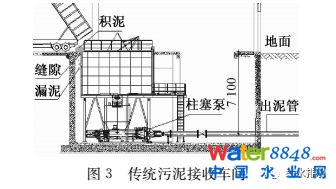 傳統(tǒng)的設(shè)計(jì)存在一定缺陷,其一,泥車卸泥時(shí)部分污泥堆積在卸料平臺(tái),積泥從縫隙掉入下部空間,既影響環(huán)境,也不利于運(yùn)行管理;其二,由于出泥管壓力大,且輸送污泥含固率高,會(huì)出現(xiàn)泥管檢修的可能,柱塞泵后出泥管為埋地管,埋深通常在7m左右,造成檢修維護(hù)困難且費(fèi)用高(如圖3所示)。