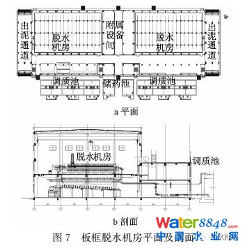板框脫水系統(tǒng)用于對(duì)污泥進(jìn)行脫水處理,是污泥處理流程中最后一個(gè)環(huán)節(jié)。板框脫水系統(tǒng)設(shè)計(jì)規(guī)模320tDS/d。主要包括調(diào)質(zhì)池、儲(chǔ)藥池、脫水機(jī)房、附屬設(shè)備間、出泥通道(如圖7所示)。