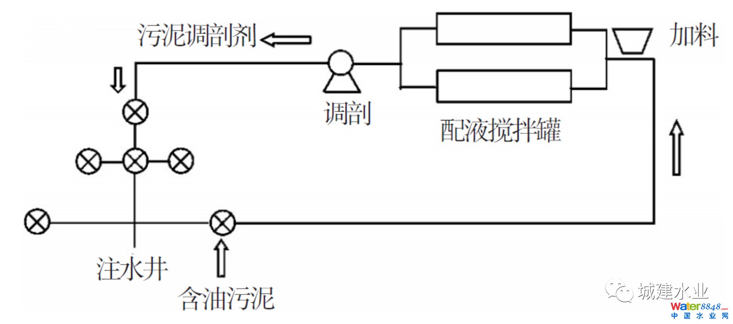回注調(diào)剖技術(shù)是利用含油污泥與油層之間有良好的配伍性,以含油污泥為基本原料,通過(guò)加入分散劑、懸浮劑等化學(xué)藥劑并進(jìn)行配伍,制成含油污泥調(diào)剖劑,用于注水井的調(diào)剖。其工藝流程如圖3.3所示:①含油污泥實(shí)施化學(xué)預(yù)處理;②含油污泥調(diào)剖;③含油污泥回注。