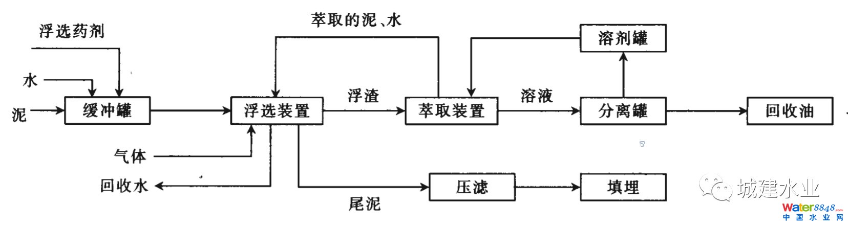 熱水洗滌法是美國(guó)環(huán)保署處理含油污泥優(yōu)先采用的方法,主要用于含泥沙多顆粒大的含油污泥的處理。一般以熱堿水溶液反復(fù)洗滌,再通過(guò)氣浮實(shí)現(xiàn)固液分離。洗滌溫度多控制在70℃左右,液固比2:l,洗滌時(shí)間20min,能將含油量為30%落地油泥洗至殘油率l%以下;旌蠅A可由廉價(jià)的無(wú)機(jī)堿和無(wú)機(jī)鹽組成。具體工藝流程見(jiàn)圖3.4。該方法能量消耗低,費(fèi)用不高,是我國(guó)目前研究較多、較普遍采用的含油污泥處理方法。
