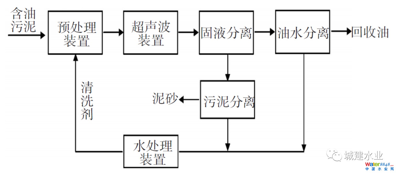 超聲處理技術(shù)是通過(guò)聲場(chǎng)的機(jī)械振動(dòng)、空化效應(yīng)及熱作用來(lái)破壞含油污泥的結(jié)構(gòu),降低污泥中原油的黏度,減小原油與無(wú)機(jī)固體間的黏附作用,從而使含油污泥中的油和泥砂分離。其工藝流程如圖3.5所示:①清洗劑預(yù)處理含油污泥;②超聲分離油泥,使原油與固體顆粒分離;③旋液分離器分離油水和泥砂,泥砂通過(guò)離心機(jī)脫水,油水經(jīng)分離器分離出油。