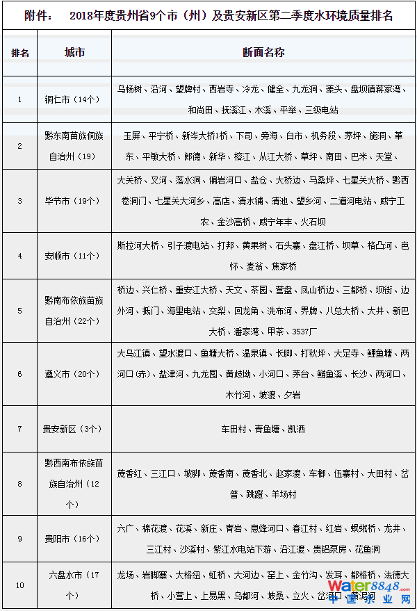 貴州省第二季度水環(huán)境質(zhì)量排名出爐 銅仁奪冠