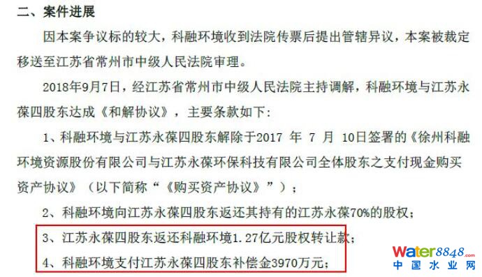 2018年9月7日,經(jīng)江蘇省常州市中級人民法院主持調(diào)解,科融環(huán)境與永葆環(huán)保4名股東達(dá)成《和解協(xié)議》。