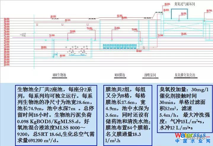 生物池部分,整個(gè)水利提留時(shí)間是18小時(shí),為多級(jí)AO的形式。后面MBR的膜系統(tǒng),膜通量是18.3升/平方米/小時(shí)的膜通量。高級(jí)氧化接觸池臭氧投加最高按30毫克做的,空?qǐng)鼋佑|時(shí)間是30分鐘。濾速5米多一點(diǎn)。