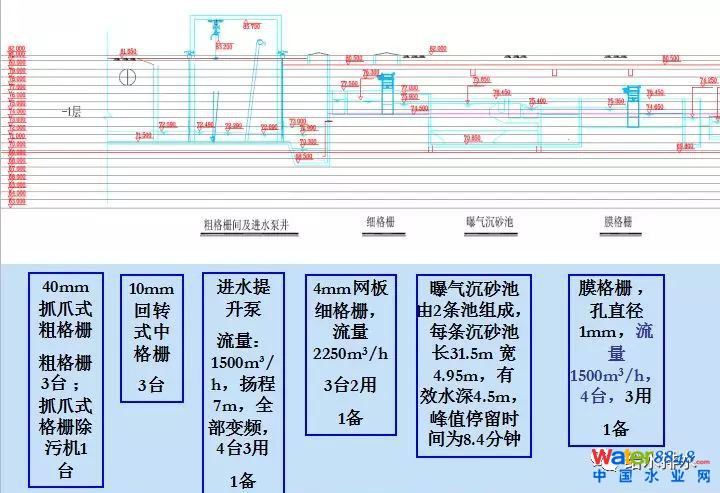 下面通過(guò)一個(gè)流程圖對(duì)參數(shù)做一個(gè)概述,抓爪式粗格柵40mm,有3臺(tái),回轉(zhuǎn)式中格柵3臺(tái),進(jìn)水提升泵是按照系數(shù)設(shè)計(jì),地下部分開(kāi)始的細(xì)格柵是4毫米的,細(xì)格柵后面是曝氣沉砂池,它的峰值停留時(shí)間能夠在8分鐘以上。沉砂池后面是一毫米的孔狀膜格柵。