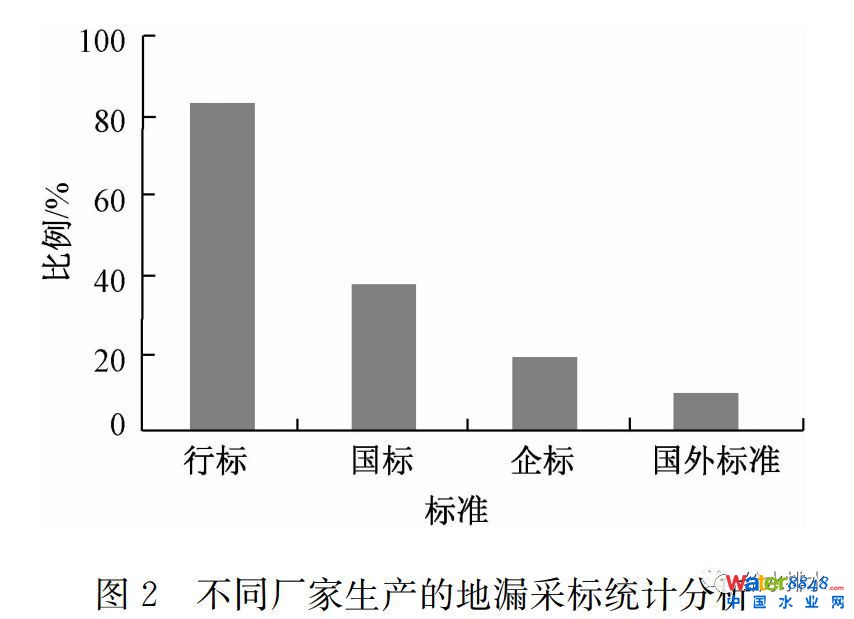 (2)目前市場(chǎng)上銷售的地漏,其產(chǎn)品標(biāo)準(zhǔn)一般由以下4種:①行標(biāo)《地漏》;②國家推薦標(biāo)準(zhǔn)《地漏》(GB/T 27710,以下簡稱國標(biāo)《地漏》);③企業(yè)自身的標(biāo)準(zhǔn);④其他國家的標(biāo)準(zhǔn)等。從圖2可以看出,行標(biāo)《地漏》的應(yīng)用更為廣泛,這是由于它在工程中應(yīng)用較早,更符合設(shè)計(jì)人員的選用習(xí)慣,技術(shù)指標(biāo)高于國標(biāo)《地漏》有一定關(guān)系。同時(shí)它也是《建筑給水排水設(shè)計(jì)規(guī)范》(GB 50015-2003,2009年版,以下簡稱“建水規(guī)”)的采標(biāo)對(duì)象。