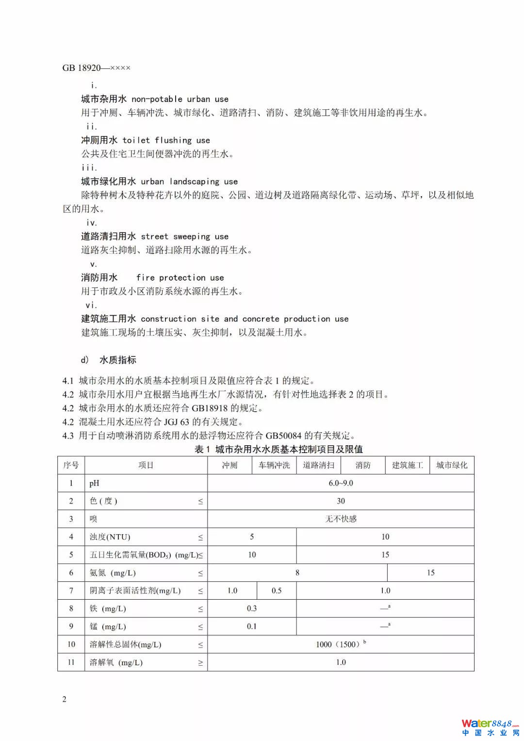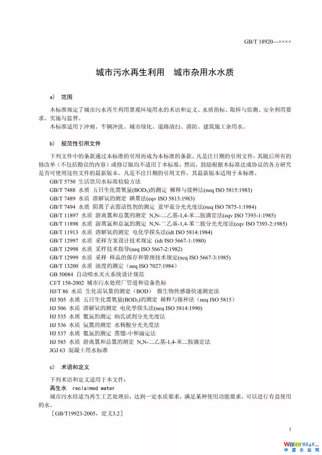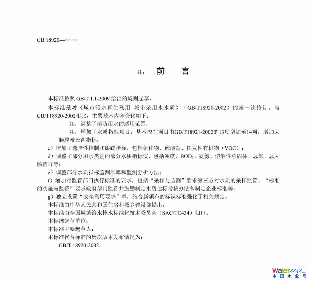 住建部發(fā)布《城市污水再生利用 城市雜用水水質(zhì)GB/T18920(修訂)》征求意見稿