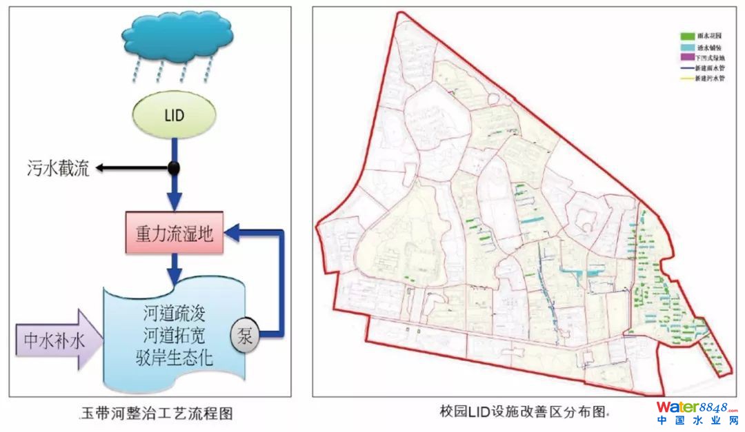 綜合玉帶河現(xiàn)狀,是個(gè)點(diǎn)、線(xiàn)、面、體的多維問(wèn)題,單一的工程解決方案無(wú)法滿(mǎn)足整治目標(biāo)。因此采取源頭、過(guò)程、末端、系統(tǒng)治理的綜合改善方案,聯(lián)合運(yùn)用綠色與灰色設(shè)施,多管齊下,以達(dá)到整治目標(biāo)。整治工程總投資約1 億元,改造內(nèi)容包括玉帶河濱水空間和海綿改造,于2016年6月份開(kāi)工建設(shè),2017年10月份竣工,現(xiàn)已投入運(yùn)行。