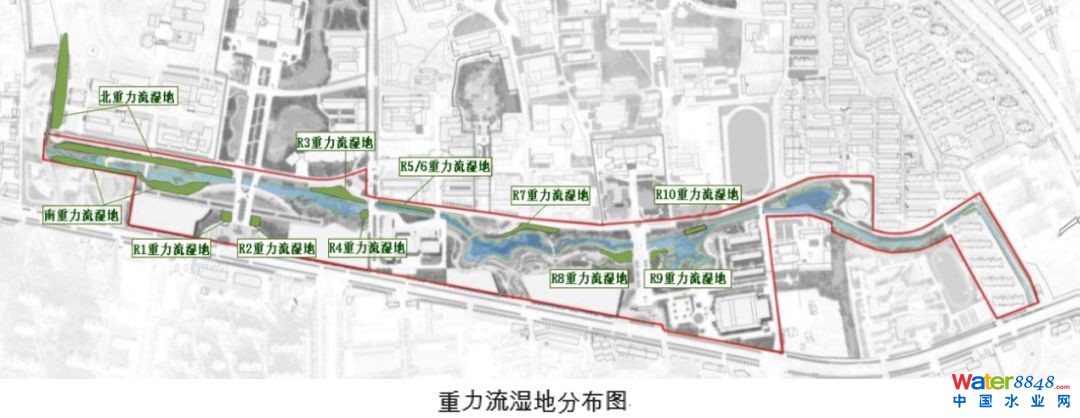 將附近京口污水處理廠每天4000m3的再生水引入上游進(jìn)行補(bǔ)水,使河流動(dòng)起來(lái),同時(shí)沿河設(shè)置數(shù)個(gè)循環(huán)水泵,平時(shí)抽水進(jìn)入重力流濕地,進(jìn)行河水的凈化循環(huán),確保水質(zhì)達(dá)標(biāo)。