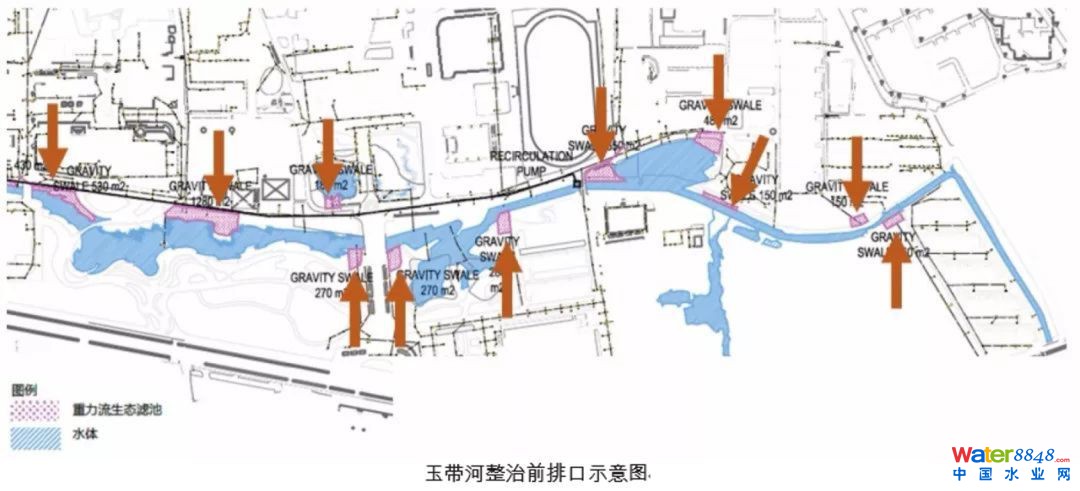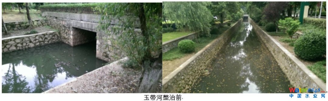 玉帶河穿過(guò)宗澤路進(jìn)入江蘇大學(xué)后,兩岸共有19個(gè)雨水排放口,雨水徑流直接排入,為整治前唯一水源。水質(zhì)方面,整治前水體長(zhǎng)期黑臭。
