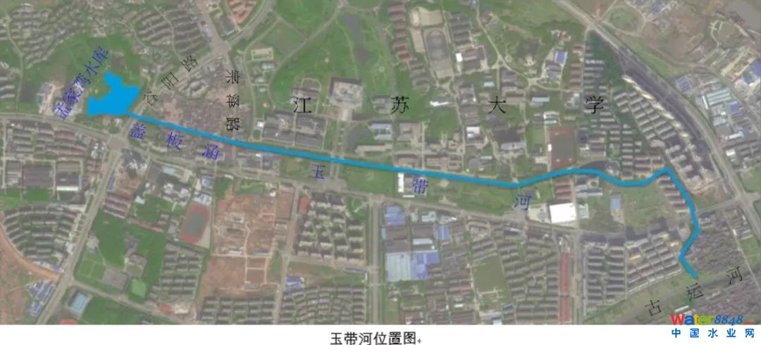 玉帶河位于鎮(zhèn)江市城區(qū)東部,學(xué)府路以北,谷陽(yáng)路以西,是江蘇大學(xué)內(nèi)的重要景觀河。玉帶河發(fā)源于孟家灣水庫(kù),最終匯入古運(yùn)河,全長(zhǎng)約2.8km,河寬10-15m,河底標(biāo)高為2.5-3m,落差甚小,幾近平底。由于孟家灣水庫(kù)無(wú)天然水源流入,其常年水位較低,無(wú)法對(duì)玉帶河進(jìn)行補(bǔ)給。