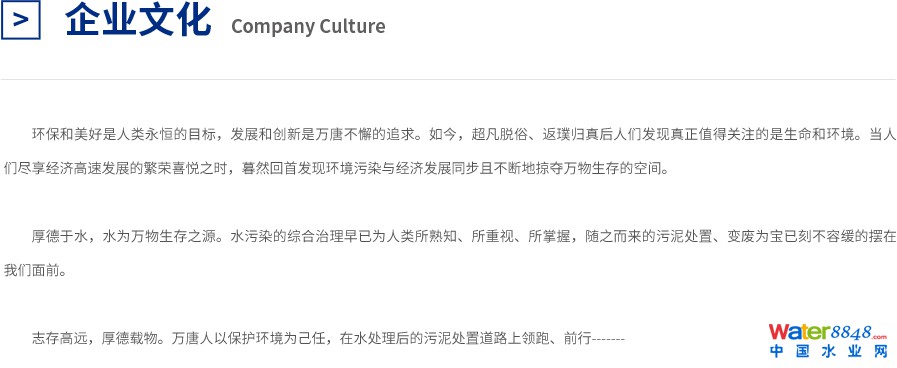 上海萬唐工程技術(shù)有限公司(waterly)是一家專業(yè)從事環(huán)保及水處理的高科技企業(yè),公司致力于給水、污水、污泥及污水回用等領(lǐng)域。主要承攬電力、核電、市政、冶金、煤炭、化工、制藥、輕工等行業(yè)給水處理、污水污泥處理、化學(xué)水處理、膜法水處理、海水淡化裝置、廢水回用等方面水處理工程,具有系統(tǒng)規(guī)劃整合與設(shè)計(jì)、設(shè)備制造、設(shè)備集成、自動(dòng)化控制系統(tǒng)、技術(shù)咨詢與服務(wù)、工程總包的實(shí)力。其中雙膜法污水回用和海水淡化技術(shù)處于國際領(lǐng)先水平,并具有核電工程的管理經(jīng)驗(yàn)。