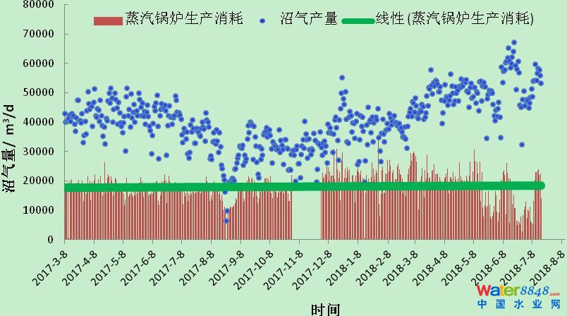 從運(yùn)行時(shí)段看,沼氣產(chǎn)量約40319m3/d,其中用于生產(chǎn)蒸汽消耗量約18150m3/d,沼氣富余量約22000m3/d。富余的沼氣,現(xiàn)況用于沼氣拖動(dòng)鼓風(fēng)機(jī)約7219m3/d。供暖季節(jié),供熱的熱水鍋爐已經(jīng)采用沼氣作為氣源。由于現(xiàn)況沼氣拖動(dòng)鼓風(fēng)機(jī)(3臺(tái))使用年限超過(guò)10年,設(shè)備故障較多,利用的沼氣量有限,出現(xiàn)即使在供暖季,沼氣的富余量也較多,F(xiàn)況剩余沼氣通過(guò)廢氣燃燒器燒掉。
