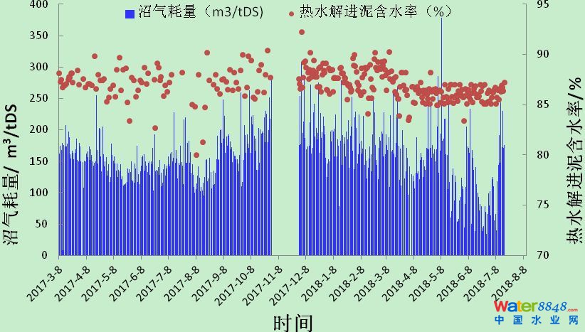 熱水解生產(chǎn)需要蒸汽。蒸汽來(lái)自消化池產(chǎn)的沼氣驅(qū)動(dòng)的蒸汽鍋爐。生產(chǎn)中引入熱水解噸干泥沼氣耗量(m3/tDS)指標(biāo)。運(yùn)行時(shí)段內(nèi),熱水解進(jìn)泥含水率平均為86.99%,噸干泥沼氣耗量平均為158.4m3/tDS。