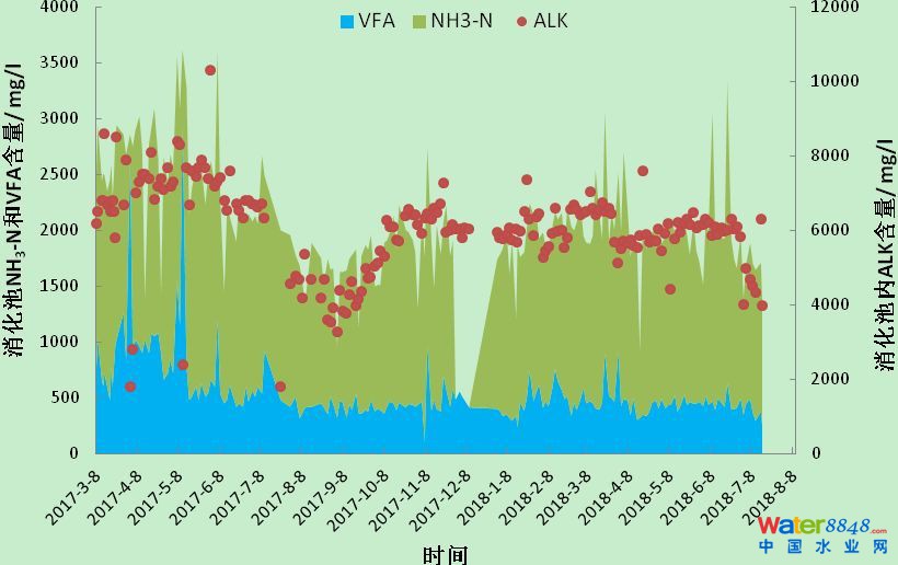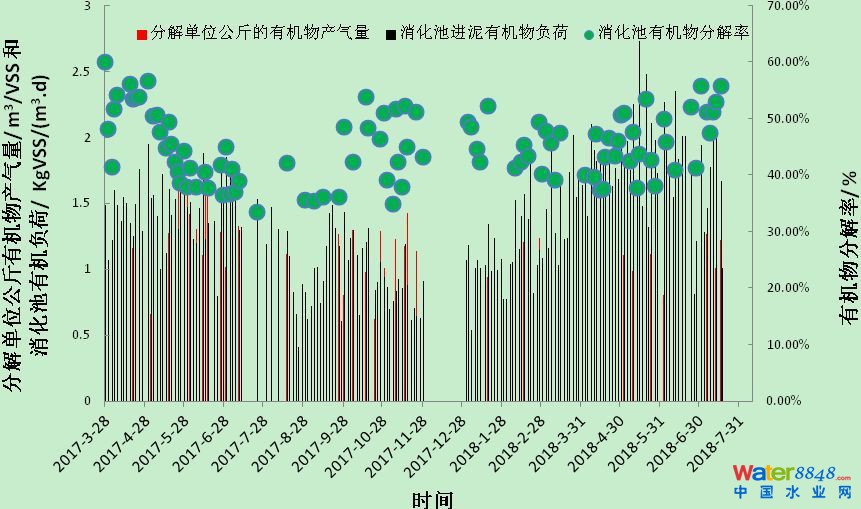 運(yùn)行時(shí)段內(nèi),消化池內(nèi)污泥脂肪酸(VFA)平均為552mg/L,堿度(ALK)平均值為6052mg/L,氨氮平均值為1532mg/L。酸堿比<0.1。有機(jī)物分解率平均45.06%,超過(guò)設(shè)計(jì)目標(biāo)值40%。分解單位公斤有機(jī)物沼氣產(chǎn)量為1.17m3/VSS,消化池有機(jī)負(fù)荷為1.35kgVSS/(m3·d)。