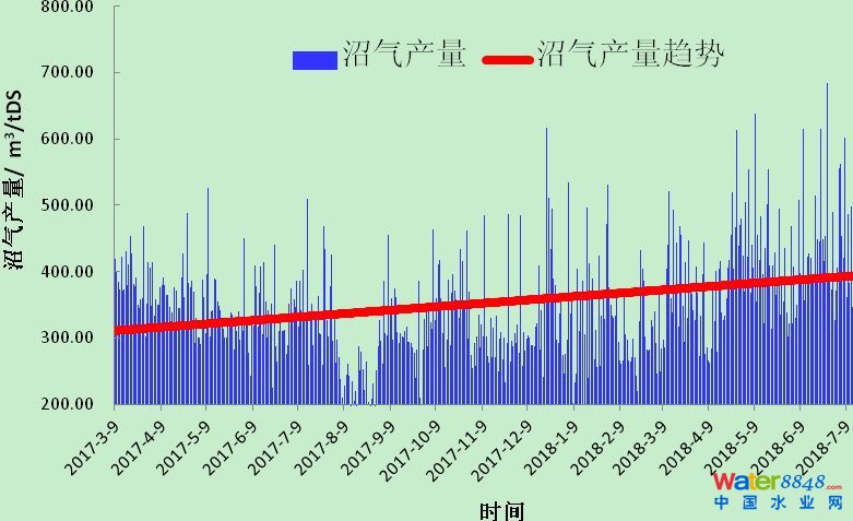 沼氣產(chǎn)氣量大于350m3/tDS,超過(guò)設(shè)計(jì)值222m3/tDS。