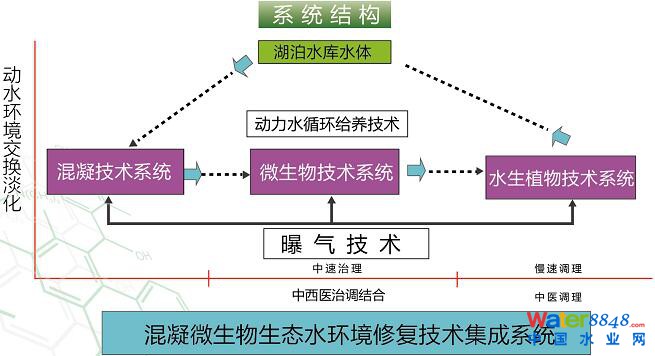 (1)混凝、微生物、水生動(dòng)植物技術(shù)的有機(jī)組合與集成,是英語開放型、大體積、長系列的江河、湖泊、水庫水體水質(zhì)凈化。