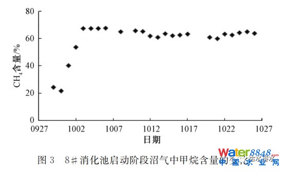 隨著消化系統(tǒng)調(diào)試開始,沼氣中甲烷含量從無到有逐漸穩(wěn)定。由于沼氣中甲烷含量與處理泥質(zhì)有關(guān),在進(jìn)泥泥質(zhì)穩(wěn)定的前提下,沼氣中的甲烷含量趨于穩(wěn)定數(shù)值,可將沼氣成分中的甲烷含量作為調(diào)試穩(wěn)定的標(biāo)志。