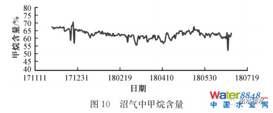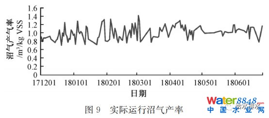 由圖9可見,運(yùn)行期間的沼氣產(chǎn)率為0.75~1.4 m³/kgVSS,平均值為1 m³/kgVSS。數(shù)值波動較小,比較穩(wěn)定。