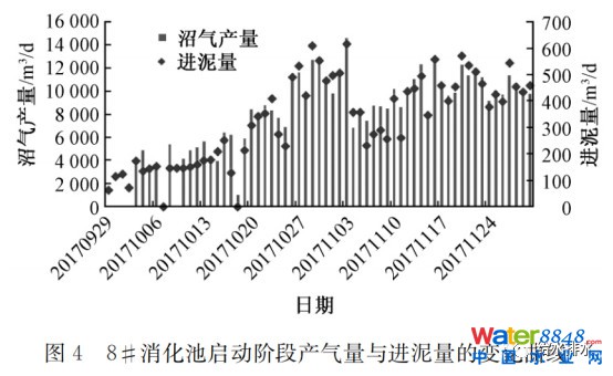 啟動前,消化池實(shí)施污泥接種,種泥來自其他污泥處理中心的消化污泥。接種量為消化池有效容積的36%。