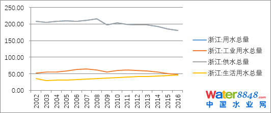 (1)以浙江為例,用水總量、工業(yè)用水量有緩慢下降趨勢,生活用水量上升較快。既說明浙江省總體產(chǎn)業(yè)結構調(diào)整的表現(xiàn),城鎮(zhèn)化建設水平提高的反映。也由此顯現(xiàn)出農(nóng)村水務市場的潛力。同時,供排水一體化,城鄉(xiāng)供水一體化的態(tài)勢更趨明顯,市場體量逐步釋放。
