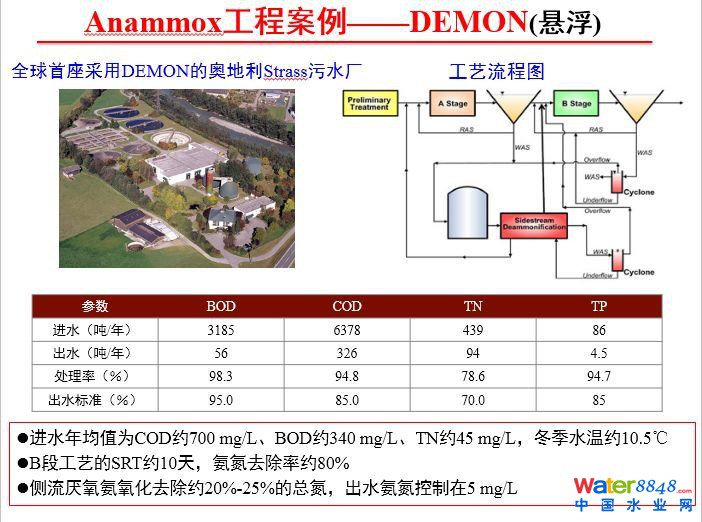 奧地利Strass污水處理廠是全球首座采用DEMON的污水廠。污泥消化液的厭氧氨氧化主要有兩個(gè)方面的核心技術(shù):一是基于pH的DO實(shí)時(shí)控制短程硝化,另一個(gè)是基于物理分離技術(shù)實(shí)現(xiàn)雙泥齡,采用旋流分離器(DEMON1.0),后改進(jìn)為微篩選擇器(DEMON2.0)。Strass污水廠目前在厭氧氨氧化做的非常成功,氨氮去除率約80%,總氮去除率20%-25%,出水氨氮控制在5mg/L以下。目前這種工藝在美國、德國、瑞士等也都做的非常好。