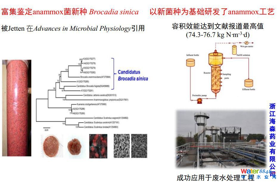 鄭平教授團(tuán)隊(duì)改進(jìn)的Anammox工藝容積效能達(dá)到文獻(xiàn)報(bào)道最高值(74.3~76.7kg N·m-3·d),并成功應(yīng)用于浙江的海森藥業(yè)有限公司廢水處理工程,這是中國第一個(gè)厭氧氨氧化廢水處理的實(shí)際工程。