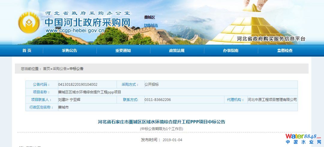 近日,河北省發(fā)布“石家莊市藁城區(qū)區(qū)域水環(huán)境綜合提升工程PPP項(xiàng)目中標(biāo)公告”,這個(gè)7.25億元的項(xiàng)目最終花落創(chuàng)業(yè)環(huán)保(600874,股吧)。