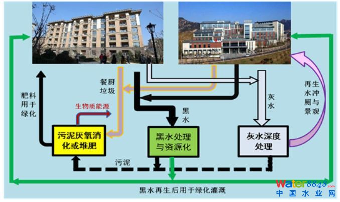 采用污水源分離并實(shí)現(xiàn)黑水能量回收和灰水資源的多用途回用(Resource,Recycle)方面,歐美等發(fā)達(dá)國家已有較小尺度的實(shí)踐案例。同濟(jì)大學(xué)、青島理工大學(xué)及德國達(dá)姆斯塔特IWAR研究所聯(lián)合提出“半集中式處理”概念,先導(dǎo)試驗(yàn)工程已在青島市應(yīng)用示范(見圖3)。