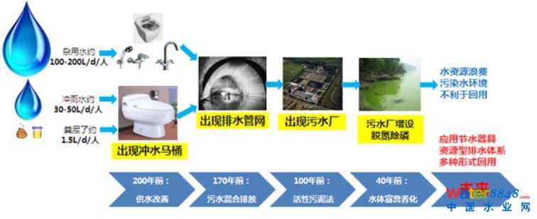 目前的城鎮(zhèn)生活用水包括飲用、洗滌、洗澡、沖廁等,其節(jié)水方法包括節(jié)水器具使用、雨水收集回用和污水再生利用等方面,這三個(gè)方面的研究和應(yīng)用問題已經(jīng)逐漸受到關(guān)注了,而排水方式上的水資源和能源浪費(fèi)問題卻往往被忽略。大約200年前,沖水馬桶引入家庭是歐洲早期城市化的標(biāo)志,在此基礎(chǔ)上沖水馬桶排污和生活污水甚至雨水混合通過下水道排放的水載重力排水系統(tǒng)得以發(fā)展,成為近代全球城鎮(zhèn)排水的基本模式。100多年前發(fā)明的活性污泥法則成為目前最重要的一種以去除COD為主的污水處理技術(shù),而被處理的混合污水中人糞尿僅占污水總量的1%左右,卻包含了污水中大部分的COD和營養(yǎng)鹽。后來隨著富營養(yǎng)化等環(huán)境污染問題的出現(xiàn),城鎮(zhèn)污水的脫氮除磷技術(shù)等得到。這些傳統(tǒng)模式都是先將人糞尿成百倍地稀釋,然后再消耗大量能量將其分離分解,在技術(shù)和經(jīng)濟(jì)方面嚴(yán)重不合理,浪費(fèi)大量水資源和能源,傳統(tǒng)模式的混合排放和遠(yuǎn)距離輸送均不利于污水的資源化和城市水圈的良性循環(huán),經(jīng)處理后的出水如要回用必將涉及較高的輸水費(fèi)用,從經(jīng)濟(jì)上又限制了再生水在城鎮(zhèn)區(qū)域的應(yīng)用。