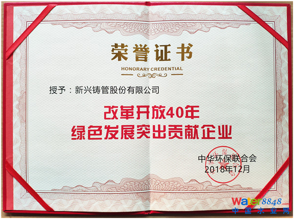 新興鑄管股份有限公司憑借改革開放40年來,遵循 “打造綠色現(xiàn)場、構(gòu)建綠色磁場、培育綠色市場”的環(huán)保理念,堅定不移走“科技、環(huán)保、質(zhì)量、效益”之路,對標世界一流水平,超前部署深度治理改造任務(wù),超低排放、綠色制造,彰顯著央企責任擔當,被中華環(huán)保聯(lián)合會授予 “改革開放40年綠色發(fā)展突出貢獻企業(yè)”稱號。
