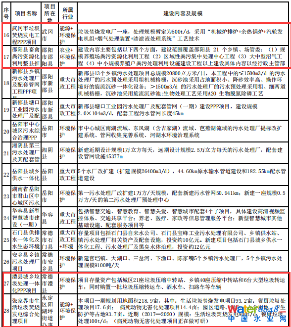 導(dǎo)讀:近日,湖南省發(fā)布了關(guān)于分解下達湖南省2019年P(guān)PP項目前期工作中央預(yù)算內(nèi)投資計劃的公示,涉及多個環(huán)保項目,其中有5個垃圾焚燒發(fā)電項目等多個固廢項目,還涉多個污水處理廠項目,詳情如下: