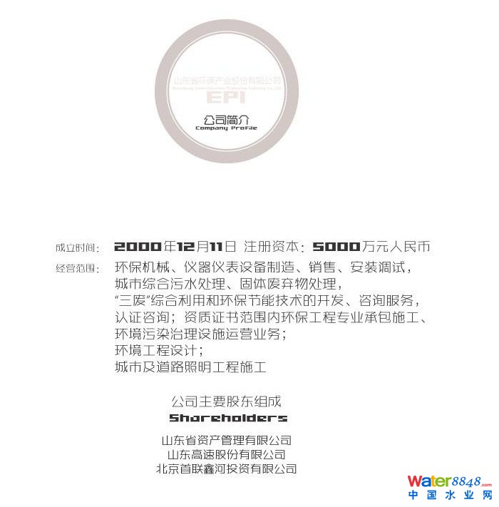 山東省環(huán)保產(chǎn)業(yè)股份有限公司成立于2000年,注冊資本5000萬元。由山東省資產(chǎn)管理有限公司、山東高速股份有限公司、北京首聯(lián)鑫河投資有限公司出資設立。 山東環(huán)保是股份制專業(yè)化環(huán)保公司,國家級高新技術企業(yè)。 公司致力成為區(qū)域環(huán)境綜合服務提供商,項目投資和工程承包兩翼發(fā)展,以行業(yè)高精技術為企業(yè)發(fā)展核心,業(yè)務涉及市政供水、污水處理(尤其醫(yī)藥、化工、印染、汽車等高難度工業(yè)廢水處理)、污泥處置、生態(tài)化工業(yè)園區(qū)建設、區(qū)域環(huán)境綜合整治等領域。 公司具備設計、施工、運營等專業(yè)服務全牌照,可實施項目投資、EPC建設、項目管理、委托運營等專業(yè)服務全鏈條。