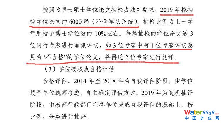 其中,在學(xué)位論文抽檢的實施方案中,教育部表示,2019年擬抽檢學(xué)位論文約6000篇(不含軍隊系統(tǒng)),抽檢比例為上一學(xué)年度授予博士學(xué)位數(shù)的10%左右。每篇抽檢的學(xué)位論文送3位同行專家進(jìn)行通訊評議,而3位專家中有一位專家評議意見為“不合格”的學(xué)位論文,將再送兩位專家進(jìn)行復(fù)議。