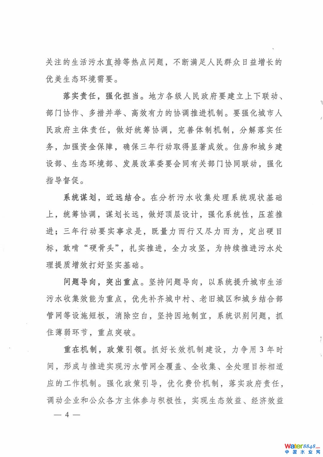 方案要求城市設(shè)要科學(xué)確定生活污水收集處理設(shè)施總體規(guī)模和布局,生活污水收集和處理能力要與服務(wù)片區(qū)人口、經(jīng)濟(jì)社會發(fā)展、水環(huán)境質(zhì)量改善要求相匹配。新區(qū)污水管網(wǎng)規(guī)劃建設(shè)應(yīng)當(dāng)與城市開發(fā)同步推進(jìn),除干旱地區(qū)外均實(shí)行雨污分流。明確城中村、老舊城區(qū)、城鄉(xiāng)結(jié)合部污水管網(wǎng)建設(shè)路由、用地和處理設(shè)施建設(shè)規(guī)模,加快設(shè)施建設(shè),消除管網(wǎng)空白區(qū)。對人口密度過大的區(qū)域、城中村等,要嚴(yán)格控制人口和企事業(yè)單位入駐,避免因排水量激增導(dǎo)致現(xiàn)有污水收集處理設(shè)施超負(fù)荷。實(shí)施管網(wǎng)混錯接改造、管網(wǎng)更新、破損修復(fù)改造等工程,實(shí)施清污分流,全面提升現(xiàn)有設(shè)施效能。城市污水處理廠進(jìn)水生化需氧量(BOD)濃度低于100mg/L的,要圍繞服務(wù)片區(qū)管網(wǎng)制定“一廠一策”系統(tǒng)化整治方案,明確整治目標(biāo)和措施。推進(jìn)污泥處理處置及污水再生利用設(shè)施建設(shè)。人口少、相對分散或市政管網(wǎng)未覆蓋的地區(qū),因地制宜建設(shè)分散污水處理設(shè)施。原文如下: