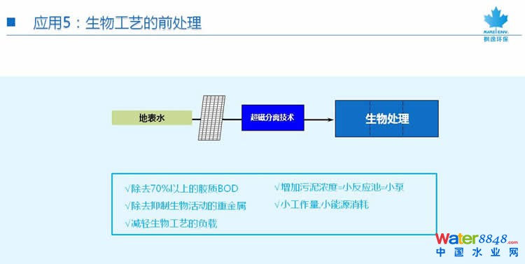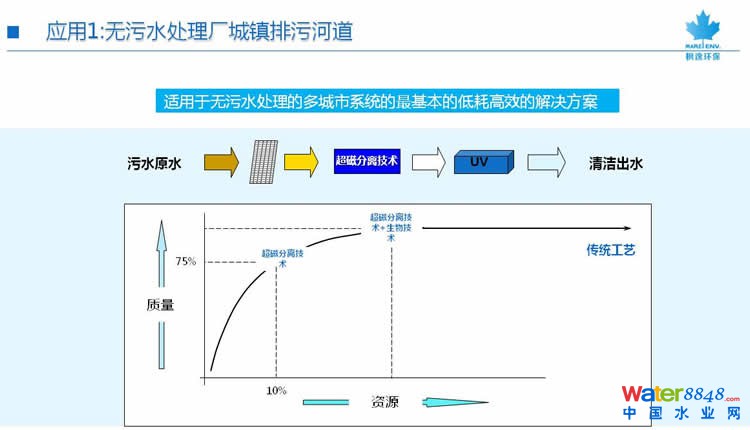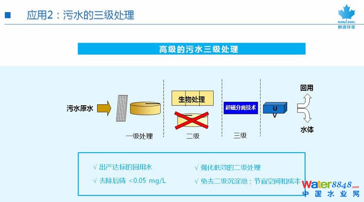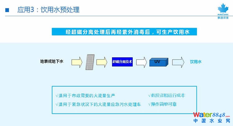 超磁過濾技術(shù)應(yīng)用領(lǐng)域 技術(shù)可應(yīng)用于水處理的多個(gè)領(lǐng)域 1、對無污水處理的城鎮(zhèn)是一個(gè)必然的低成本解決方案 2、是凈化污水用于再循環(huán)/再生水三級處理的最佳工藝 3、是替代傳統(tǒng)一級和二級澄清的優(yōu)選技